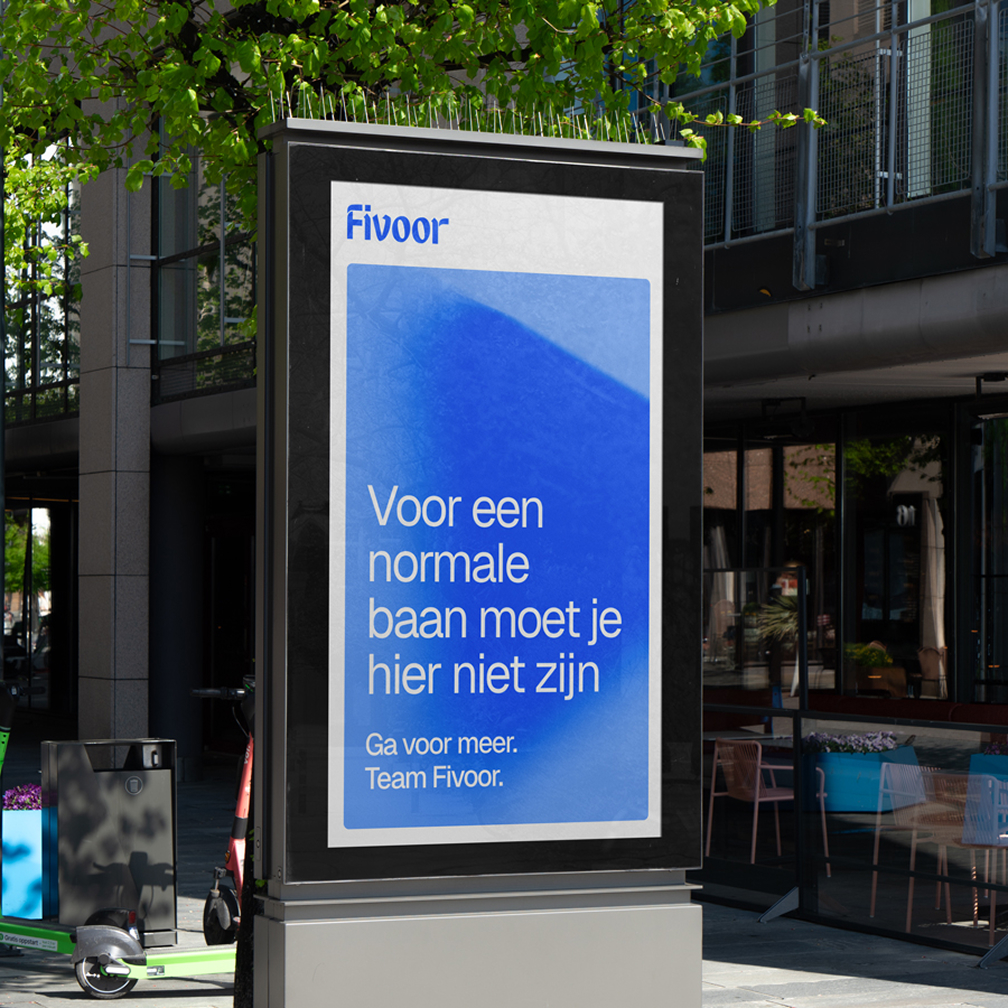 Fivoor staat midden in de samenleving. De organisatie maakt dagelijks keuzes die grote impact hebben op patiënten, medewerkers en de maatschappij. Die verantwoordelijkheid vraagt om meer dan een logo of huisstijl. Het vraagt om een merk dat richting geeft.We helpen Fivoor om die positie met overtuiging in te nemen: duidelijk, menselijk en standvastig. Van een organisatie die reageert, naar een merk dat het voortouw neemt. Een autoriteit die durft te laten zien dat zorg en richting hand in hand kunnen gaan. Zelfs als het moeilijk wordt.