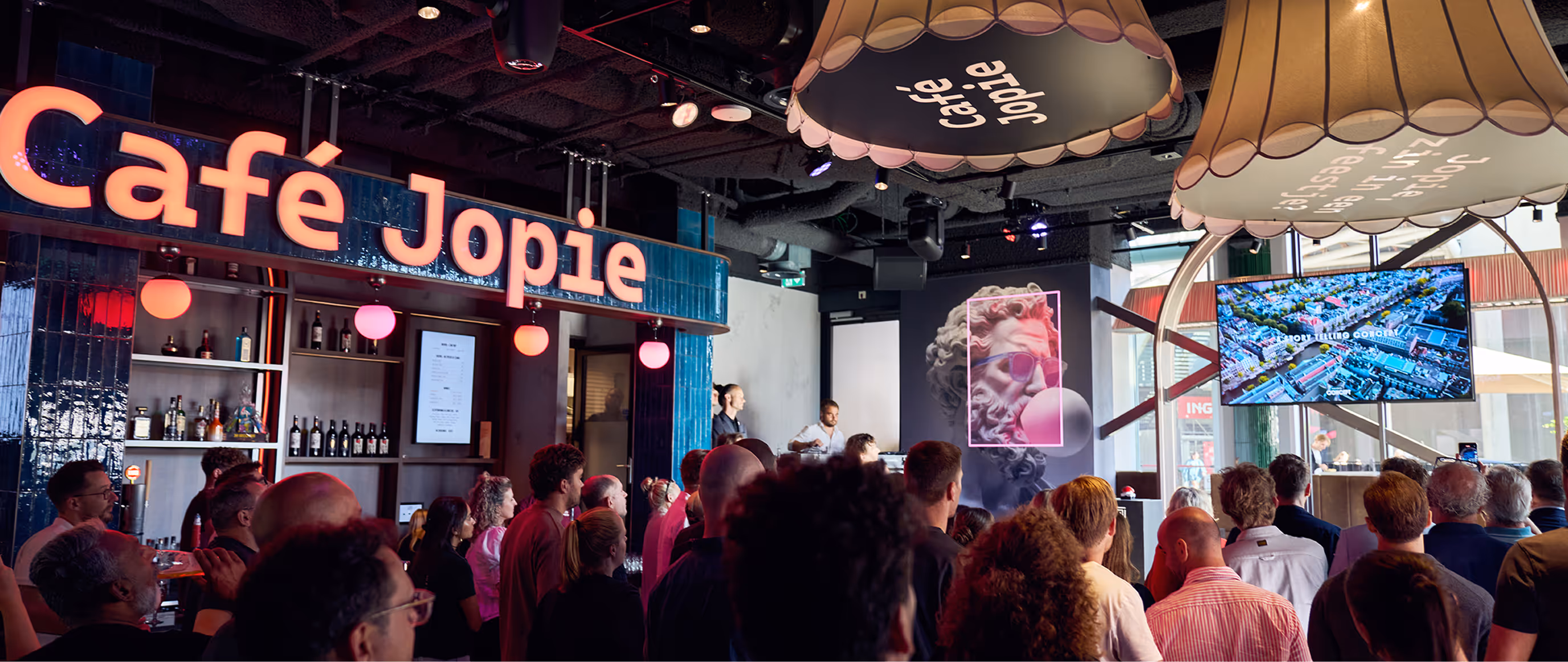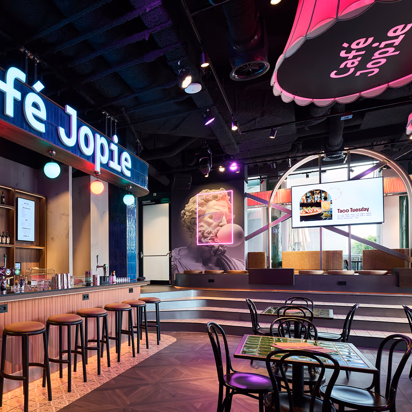 Ledschermen, belichting, meubilair en muziek maken het interieur van Jopie aanpasbaar voor verschillende gelegenheden. Die flexibiliteit brengen we ook onder in het merk. In een stedelijke omgeving waar beton en hoogbouw overheerst, brengt Café Jopie altijd de sfeer die je op dat moment zoekt: just the right vibe!