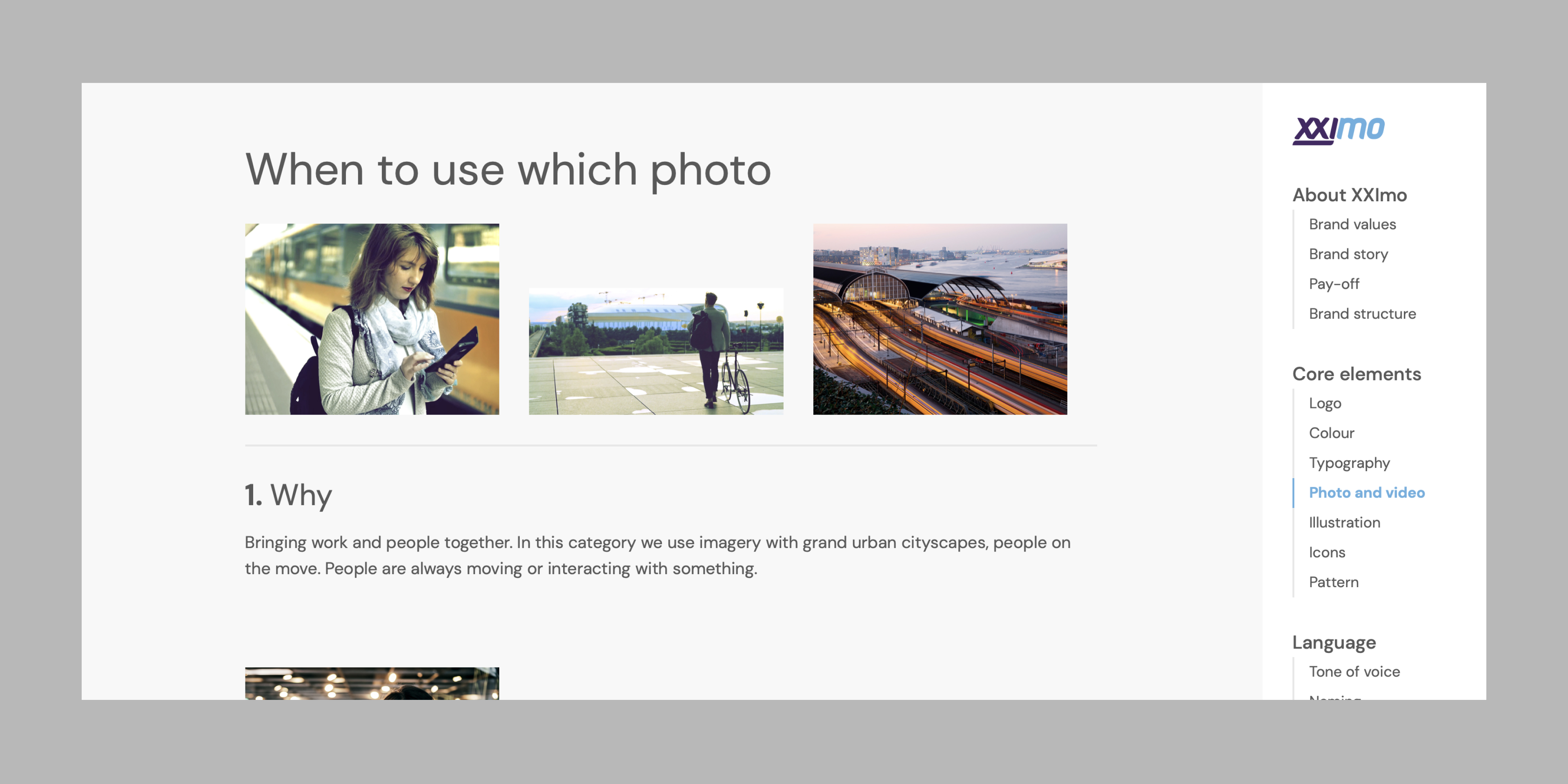 De nieuwe positionering en pay-off vormen het startpunt voor een visuele merkidentiteit waarmee XXImo de toekomst in kan. Van het logo en een kleurenpalet tot en met een beeldtaal die is opgebouwd uit fotografie, illustraties en iconen. De Code geeft het complete merk een flinke upgrade. Dit leggen we allemaal vast in een online brand manual dat de herkenbaarheid en de consistentie van het merk bewaakt.